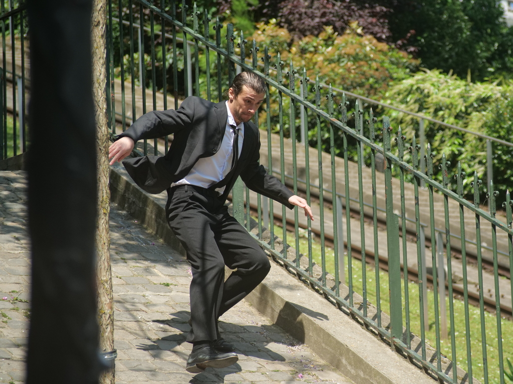 Démonstration de combat scénique avec chutes, bâtons et acrobaties.